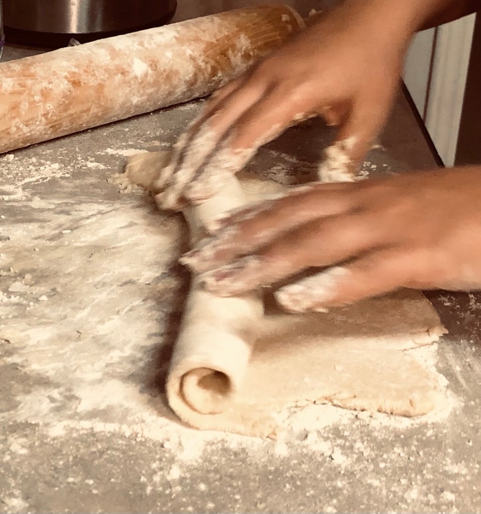 - Add flour to the top of the dough and onto your rolling pin. Gently roll the dough to desired size, folding the dough back in if necessarily to make sure it is an even thickness all over. (make sure it’s not sticky, add flour if it is)