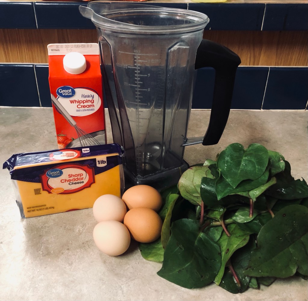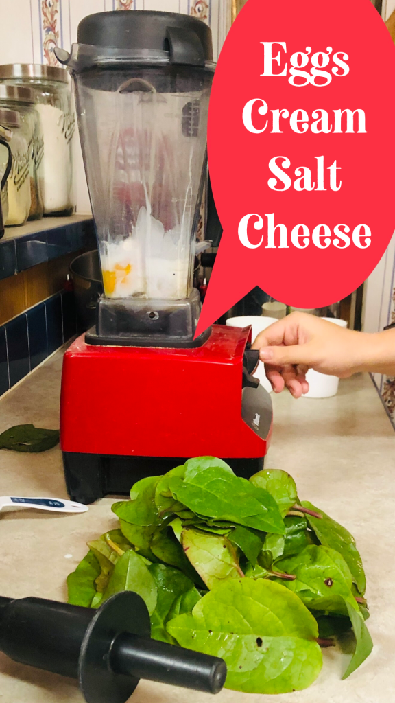 - Add eggs, cream, salt, pepper, and cheese into vitamix and blend medium (4-5) for about 10 seconds.