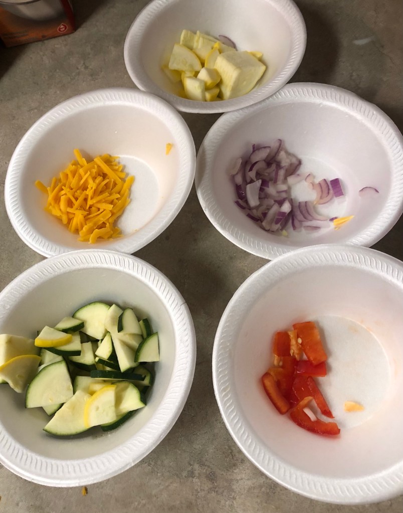 There we have the unbaked spinach quiche. Next up, salad fixings. I had some squash, onions, bell pepper, and cheese leftover so I made a dump quiche.